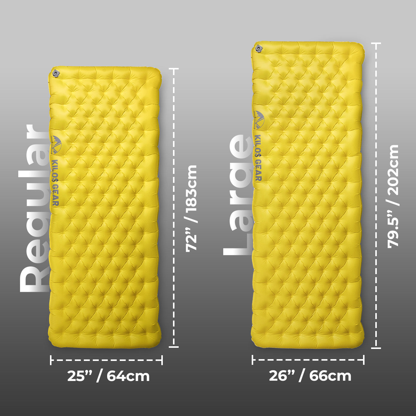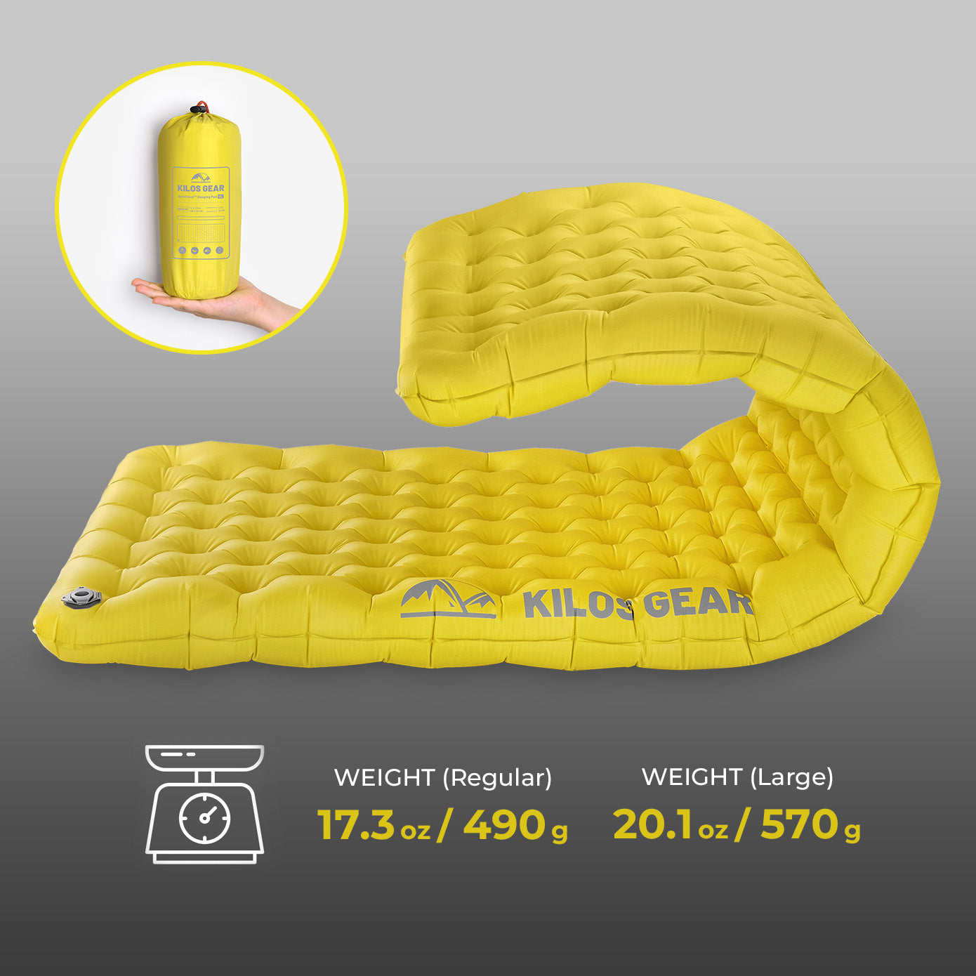 The pad weighs only 17.3 oz (490 g) in the Regular size, and 20.1 oz (570 g) in the Large size. It packs down to 9.4×3×3 in / 24×7.5×7.5 cm in the Regular size, and 9.8×3.2×3.2 in / 25×8×8 cm in the Large size, making it perfect for campers and backpackers who want to keep the weight down without sacrificing comfort.